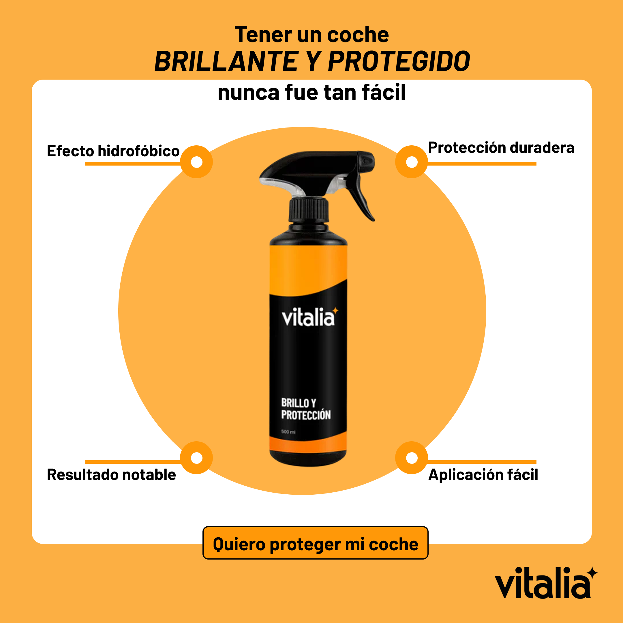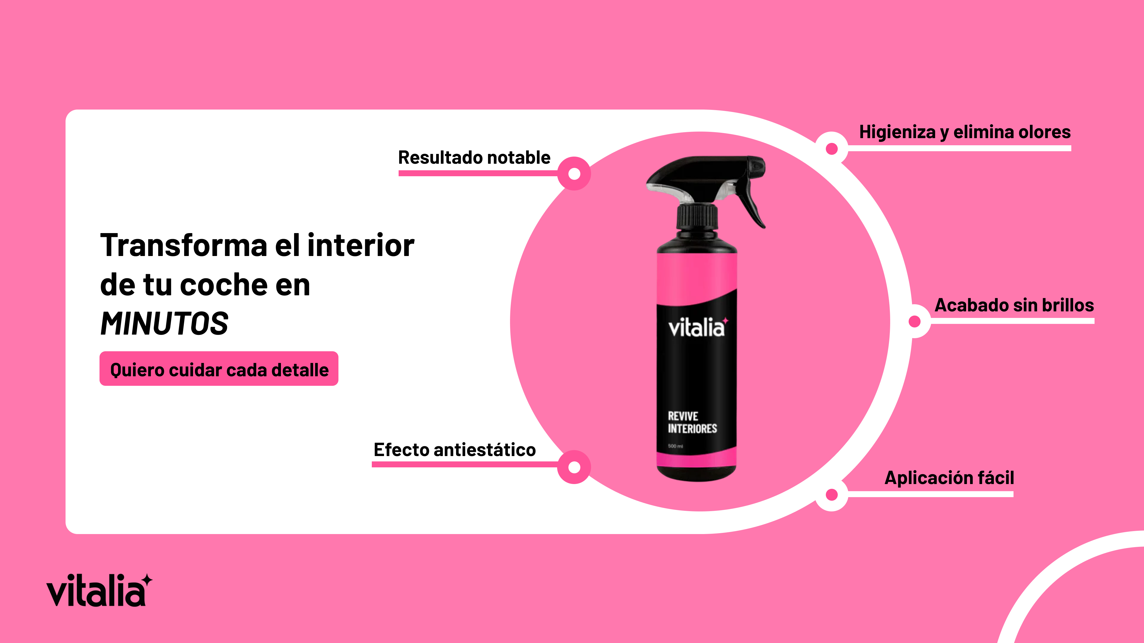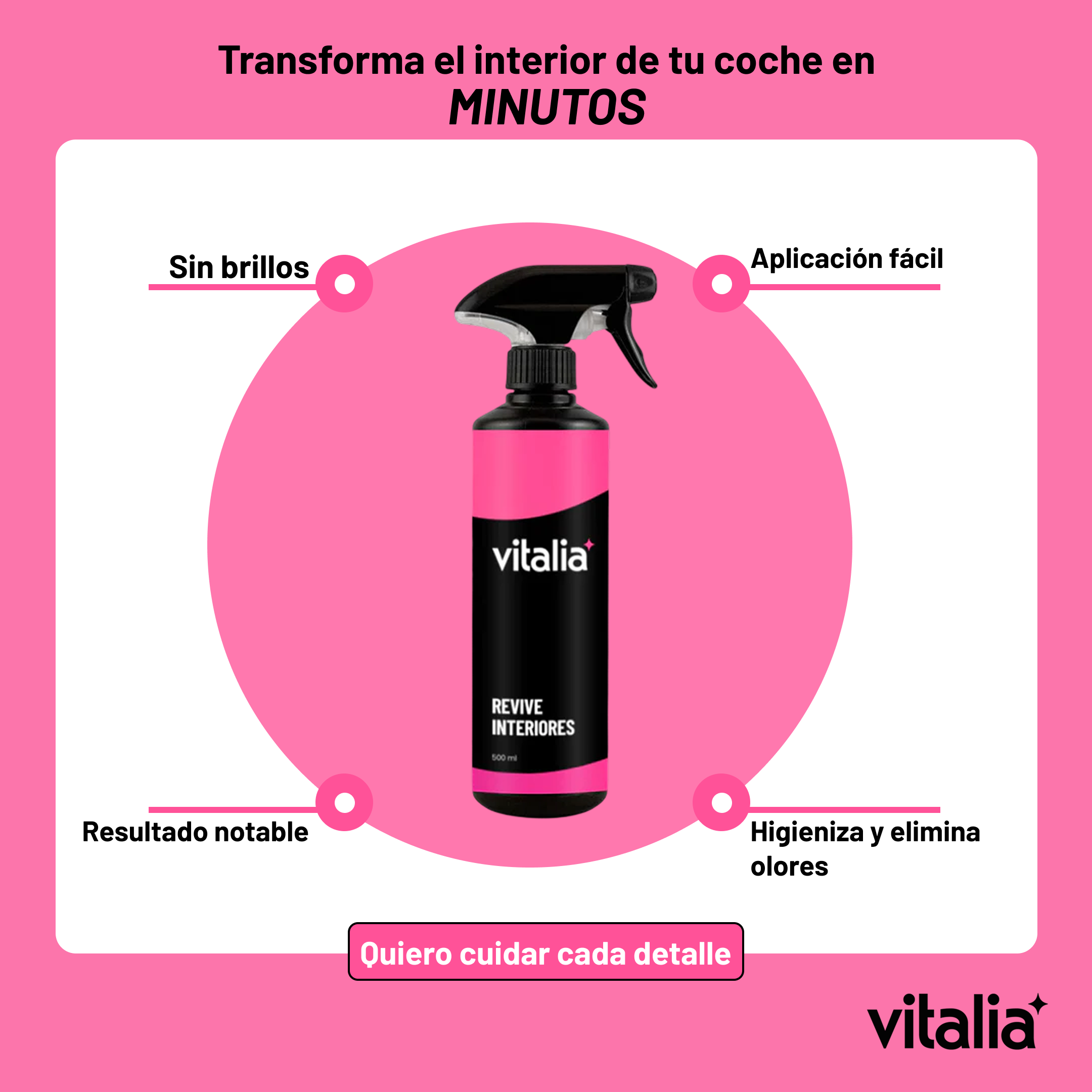 Simplicidad y claridad. Vitalia no busca que compres más, sino que compres mejor: pocos productos, bien explicados y con resultados reales. Eliminamos la confusión del “detailing técnico” para que cualquier persona pueda mantener su vehículo impecable con una rutina fácil y efectiva.